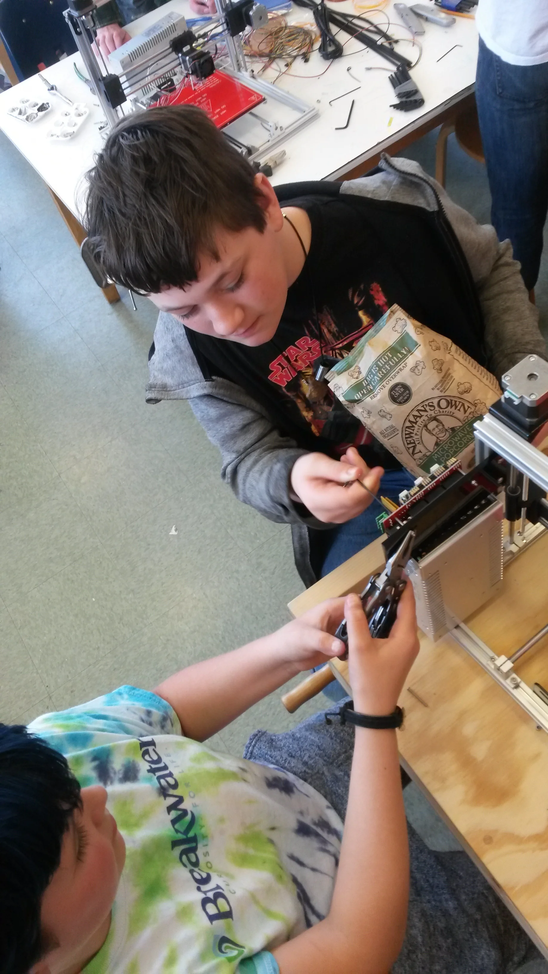 /As the tinkering space at Breakwater school continues to metamorphose into our Curiosity Lab, opportunities for young engineers to make, discover, experiment and invent are made possible. March 18 and 19 the Open Bench Project partnered with Breakwater school to offer a 3d printer building workshop. Yes. Printer building. With the help of experienced workshop leaders, participants were offered a chance construct their own aluminum Folger Tech Prusa i3 3d printer together.